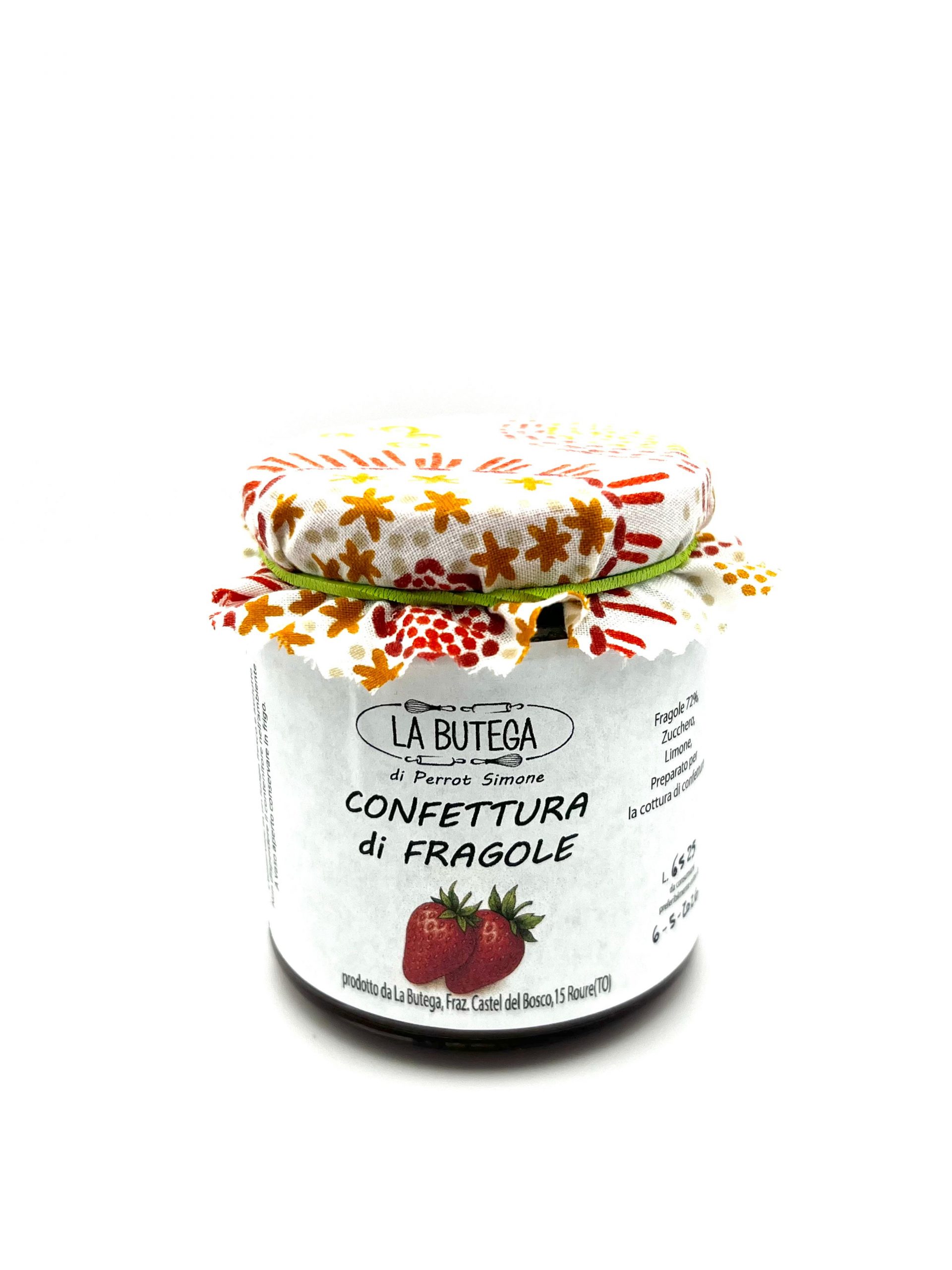 Confettura artigianale La Butega: 72% di Fragole piemontesi. Dolce e genuina, perfetta per dolci, colazioni e abbinamenti gourmet.