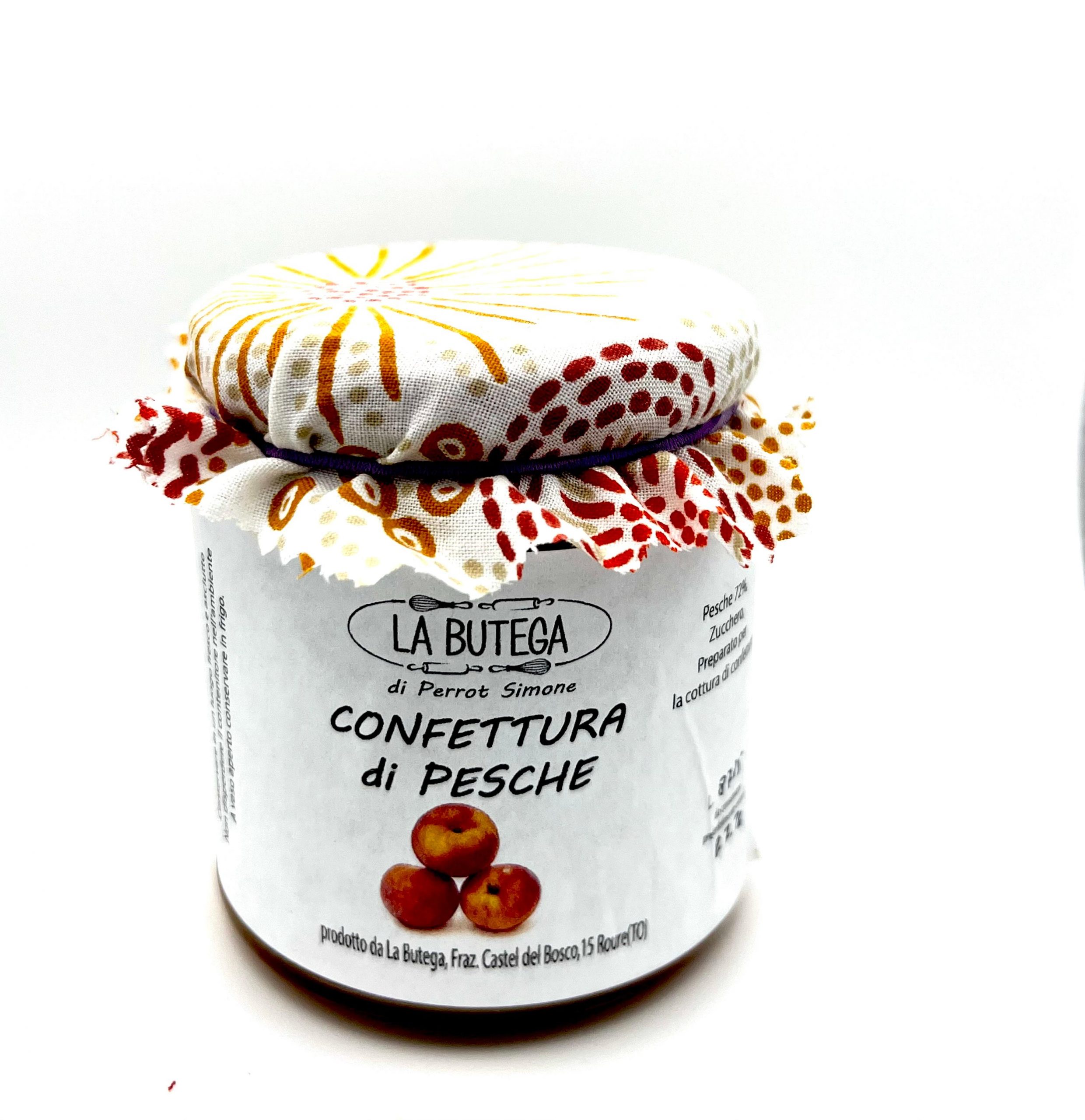 Confettura artigianale La Butega: 72% di pesche locali, gusto autentico e naturale. Perfetta per colazioni sane e dolci genuini.