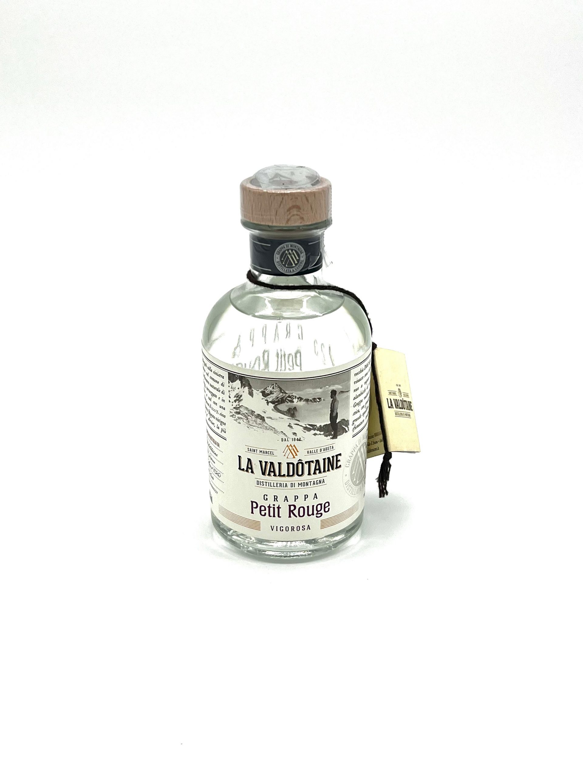 Grappa elegante e territoriale, distillata da vinacce fresche di uve Petit Rouge, vitigno autoctono valdostano alla base dei più noti vini rossi della regione. Prodotta con alambicchi discontinui a bagnomaria, si presenta armonica, fragrante e persistente, con un profilo sensoriale che richiama le caratteristiche tipiche del vitigno.